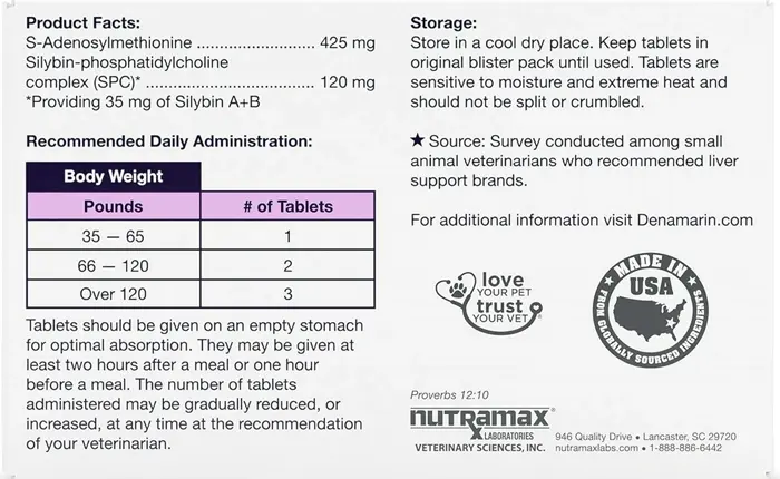 Hepatic Aid for Canines: Denamarin is the #1 vet endorsed liver support product for dogs. This supplement contains S-Adenosylmethionine to help increase levels of the antioxidant glutathione – one of the liver’s primary detoxifying compounds. High-Quality Components: The Silybin in inside Denamarin has demonstrated better absorption by dogs than the common milk thistle extract found inside many other supplements. Support Your Dog’s Liver Health: The liver is one of the most important organs in your companion and is crucial for eliminating toxins, storing energy, assisting digestion, and aiding the immune system. From the #1 Vet Recommended Supplement Company: Nutramax Labs Veterinary Science has been a pioneer in animal wellness for 30 years and offers supplements to support joint health, gut wellness, and overall health. Supported by Science: Nutra Max Labs Vet Sciences products are veterinarian formulated with premium components to guarantee your companion is geting a safe supplement.