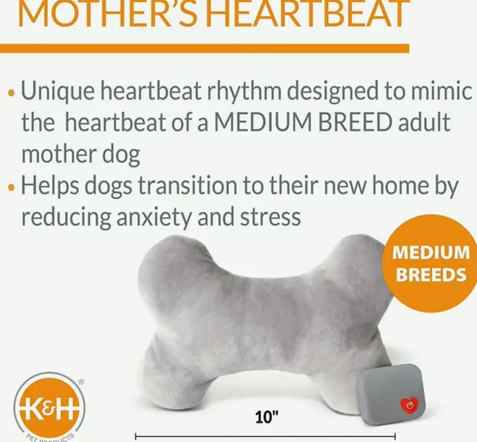 Pick the appropriate breed size calming pillow for your pet. Three sizes available. Distinct heartbeat rhythm imitates the mother’s heartbeat for each specific breed size. The mother’s heartbeat helps in making the move to your pet’s new home and reduces anxiety. The soothing cushion features a machine washable, bone-shaped pillow and a detachable heartbeat unit. Assist in puppy training by minimizing undesirable actions, like less barking and crying during crate training. Designed by K&H boasting more than 20 years of experience in creating reliable, innovative, quality items for animals.