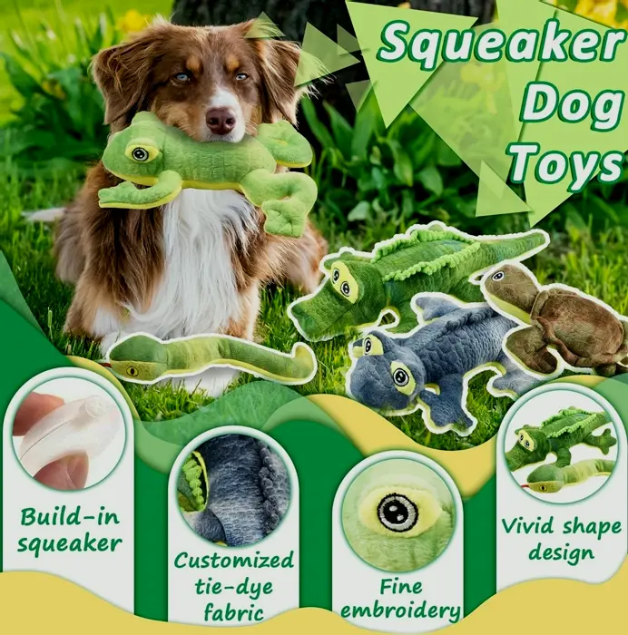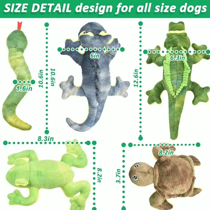 Great Value Pet Toy Set: The collection contains 5 popular plush animals toys – alligator, frog, turtle, lizard, and snake. This is the new forest series from LECHONG!